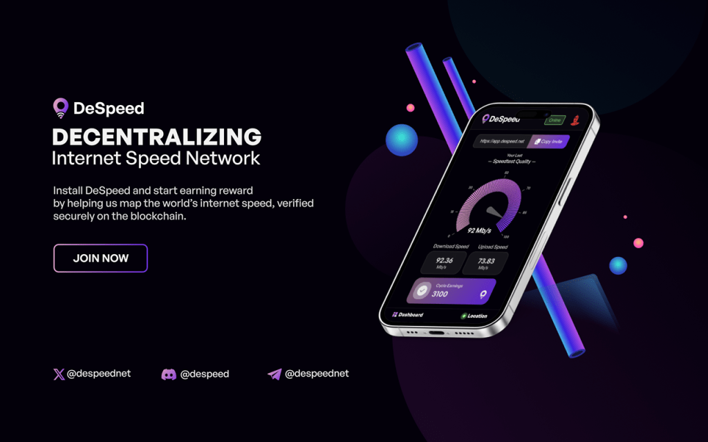 DeSpeed is the world’s first decentralized network for internet speed verification, powered by real-time blockchain validation. It verifies internet speed data from users and rewards them with tokens.